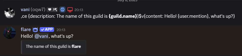 Since some commands support both plain text and embed formatting, you must indicate when you’re using an embed. Begin your embed with{embed}$v