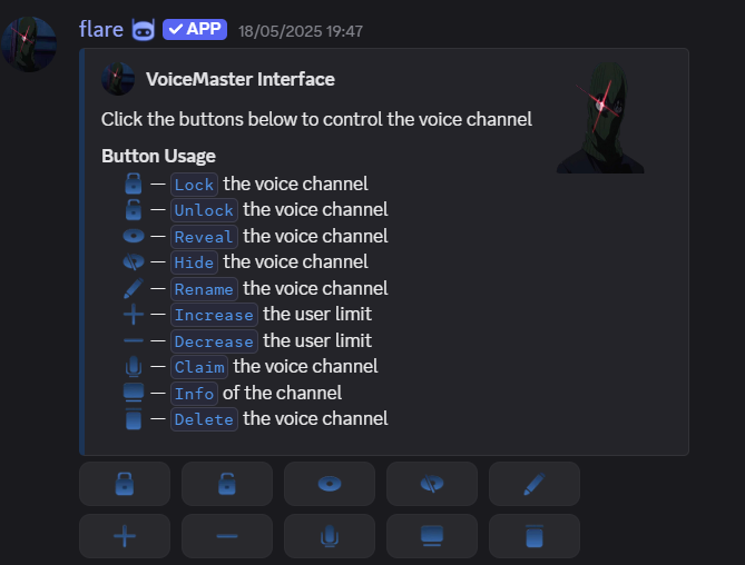 channel will contain an embed with buttons that allow members to customize their temporary voice channel. This channel should be locked to keep the embed message at the top of the channel.